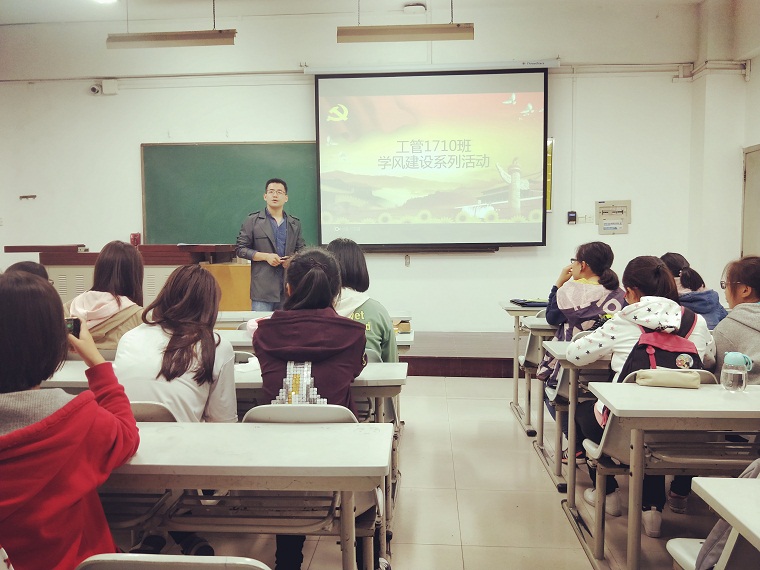 在二零一七年国庆到来之际,为培养学生爱国精神,激发同学学习积极性,进一步提升班级凝聚力,suncitygroup太阳新城工管1710班于9月28日傍晚在8号教学楼召开了学风建设系列活动。此次活动由班主任侯现慧老师亲自主持,全体班级成员参与。