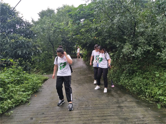 在早上九点,队员们来到了杉树村。盛夏的蜀地,天气异常炎热,再加上杉树村的入户道路均是山路,更是为队员们的调研之路增添了难度。队员们在迂回曲折的山路中走到了10点,终于找到了一位在家做农活的阿姨,了解到队员们的来意后,阿姨热情、详细的回答了队员们的问题,也耐心的填制了调查问卷。最后,她还带领队员们实地观察了杉树村的垃圾处理点。通过阿姨的描述,队员们知道了杉树村的土地流转制度并没有落实到实处,也知道了该村的养老保险制度,医疗保险制度还存在部分问题。