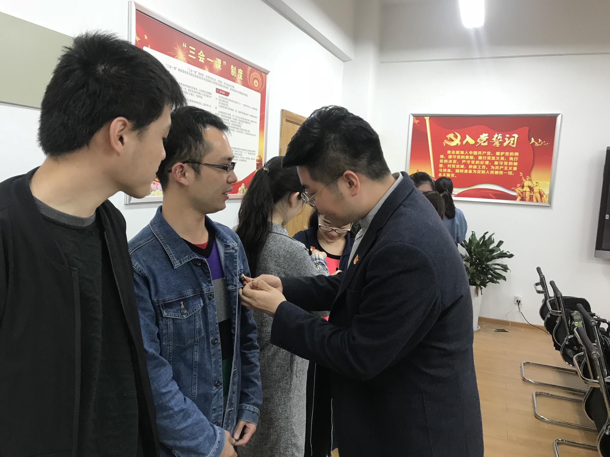 随后,张鹏飞宣读学院开展“亮身份·践承诺·树形象”活动的通知,全体党员及预备党员在支部书记张鹏飞的带领下进行宣誓,并对本次“亮身份·践承诺·树形象”主题实践活动进行详细介绍,国贸支部全体党员及预备党员写下自己的承诺,其中有同志写到:自觉鉴定理想信念,认真学习党的各种先进理论,做学习型党员。随后支部书记逐个为国贸支部成员佩戴党徽,同志们均表示感到非常的光荣与自豪,此次党组织生活在庄严的国际歌中结束。